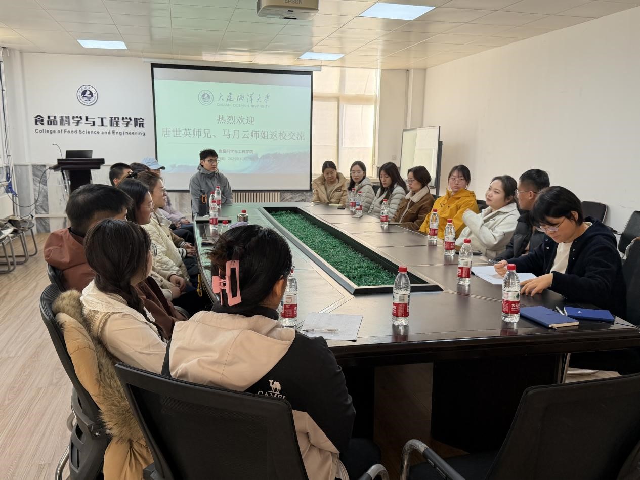 2025年10月23日,学院邀请两位优秀员工——2022届专硕、上海海洋大学博士研究生唐世英和2023届学硕、集美大学博士研究生马月云返校,与部分在校研究生座谈,分享科研体会。