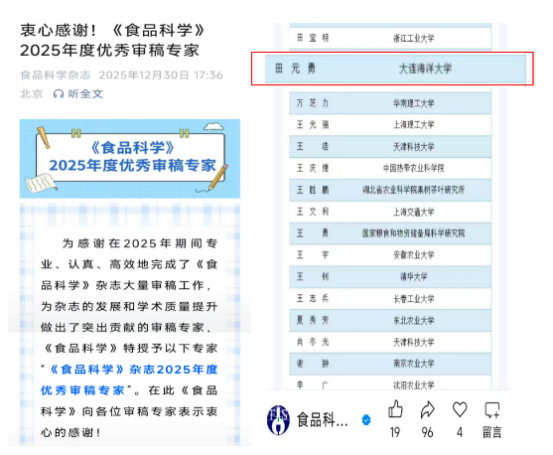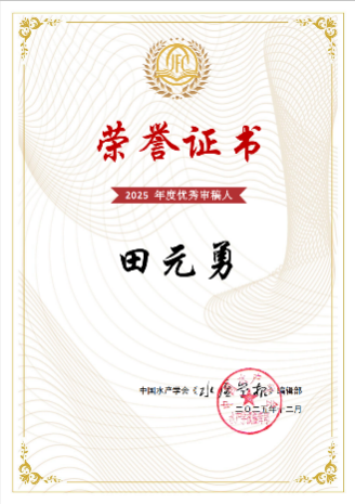 近日,食品与水产领域国内权威学术期刊《食品科学》《水产学报》分别公布年度优秀审稿人名单,公司田元勇副教授凭借高质量的审稿意见、严谨的评审态度以及高效的审稿响应,同时获评两刊的“优秀审稿人”称号。