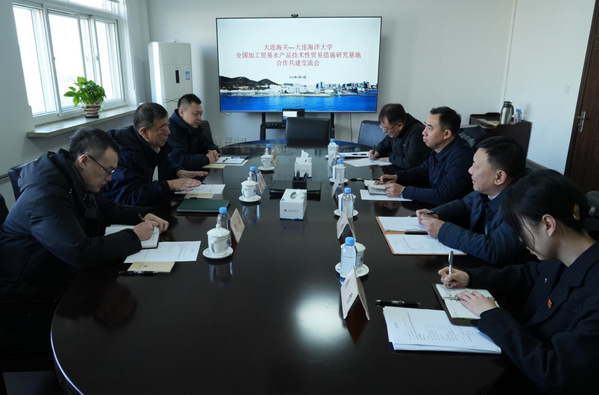 1月15日,公司与大连海关“全国加工贸易水产品技术性贸易措施研究评议基地”合作共建交流会在行政楼第二会议室召开。大连海关进出口食品安全处处长马勇、副处长邱向锋、科长闫俊来校交流。公司董事长杜明出席会议。创新创业学院经理郑鹏,我院经理武龙、副经理桑雪、办公室主任刘雨竹参加会议。